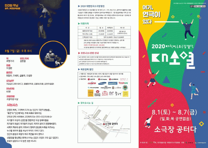 °ø¿¬Àº À¯·á·Î ÁøÇàµÇ¸ç ÀÎÅÍÆÄÅ©, ¿Á¼Ç, ¿¹½º24, ¹®ÈNƼÄÏ µîÀÇ ¿Â¶óÀΰú ÇöÀ忹¸Å°¡ °¡´ÉÇÏ´Ù. ƼÄϰ¡°ÝÀº ÀÏ¹Ý 20,000¿ø, û¼Ò³â 15,000¿øÀ̸ç 20ÀÎ ÀÌ»ó ´Üü·Î °ü¶÷ ½Ã¿¡´Â ÀÏ¹Ý 15,000¿ø, û¼Ò³â 10,000¿øÀ¸·Î ÇÒÀÎÇýÅÃÀ» ´©¸± ¼ö ÀÖ´Ù. ¶ÇÇÑ 3ÀÛǰ ÆÐ½º±ÇÀ» ±¸ÀÔÇϸé 40,000¿øÀ¸·Î °ü¶÷ÀÌ °¡´ÉÇÏ´Ù.