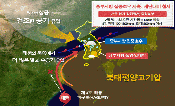 5ÀϱîÁö ÁߺÎÁö¹æ°ú ºÏÇÑÁö¿ªÀ» ¿À¸£³»¸®´Â Á¤Ã¼Àü¼±ÀÇ ¿µÇâÀ¸·Î ¸¹Àº ºñ°¡ ¿¹»óµÇ´Â °¡¿îµ¥, Áß±¹ ³²µ¿ÇؾÈ(»óÇØ³²ÂÊ)À» ÇâÇØ À̵¿ ÁßÀÎ Á¦4È£ ÅÂdz ¡®Çϱ¸ÇÍ(HAGUPIT)¡¯¿¡ µ¿¹ÝµÈ ¸Å¿ì ¸¹Àº ¾çÀÇ ¼öÁõ±â°¡ ¿ì¸®³ª¶ó·Î Ãß°¡ À¯ÀÔµÇ¸é¼ ¾ÕÀ¸·Î ³»¸®´Â ºñÀÇ °µµ´Â ´õ¿í °ÇØÁú °ÍÀ¸·Î ¿¹»óµÈ´Ù.