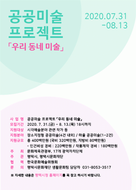 À̹ø ÇÁ·ÎÁ§Æ®´Â ÆòÅýÃÀÇ Áö¿ª ÀÚ¿ø°ú ½ºÅ丮¸¦ ¹Ý¿µÇÏ¿© Àå¼ÒÁöÁ¤Çü °ø°ø¹Ì¼ú(½ÅÀ嵿 ¹Ì±ºÃ¶µµº¯, 4~5ÆÀ ³»¿Ü, ÆÀ´ç ¾à 7,500¸¸¿ø), ¸¶À» °ø°ø¹Ì¼ú(°ü³» ¸¶À» 1°³¼Ò ÀÚÀ¯ ¼±ÅÃ, 1~2ÆÀ, ÃÑ 1¾ï¿ø) 2°³ ºÐ¾ß·Î ½ÅûÀ» ¹Þ´Â´Ù.