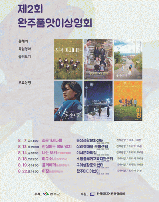 »ó¿µÀÛÀº ¡®Ä¥°î °¡½Ã³ªµé(7ÀÏ ¿ÀÈÄ 2½Ã, µ¿»ó»ýȰ¹®È¼¾ÅÍ)¡¯, ¡®Âù½ÇÀÌ´Â º¹µµ ¸¹Áö(13ÀÏ Àú³á 8½Ã ¾ß¿Ü»ó¿µ, »ï·ÊÃ¥¸¶À»¹®È¼¾ÅÍ)¡¯, ¡®³ª´Â º¸¸®(14ÀÏ ¿ÀÀü 10½Ã, À̼¹®ÈÀÇÁý)¡¯, ¡®¾ß±¸¼Ò³à(18ÀÏ ¿ÀÈÄ 3½Ã, ¼Ò¾çÇ®»Ñ¸®±³À°Áö¿ø¼¾ÅÍ)¡¯, ¡®À±Èñ¿¡°Ô(19ÀÏ ¿ÀÈÄ 2½Ã, ±¸ÀÌ»ýȰ¹®È¼¾ÅÍ)¡¯, ¡®ÀÌÀå(22ÀÏ ¿ÀÈÄ 2½Ã, ¿ÏÁ̵ֹð¾î¼¾ÅÍ)¡¯ µî ÃÑ 6ÆíÀÌ´Ù.