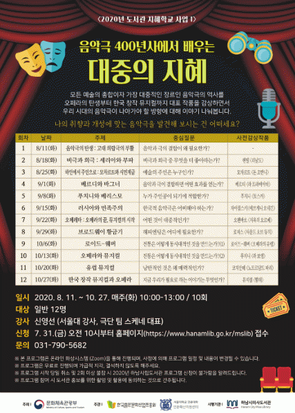 Çϳ²½Ã¹Ì»çµµ¼°üÀÌ ÁøÇàÇÏ´Â ¡®À½¾Ç±Ø 400³â»ç¿¡¼ ¹è¿ì´Â ´ëÁßÀÇ ÁöÇý¡¯´Â ¸ðµç ¿¹¼úÀÇ ÃÑÇÕÀÌÀÚ °¡Àå ´ëÁßÀûÀÎ À帣ÀÎ À½¾Ç±ØÀÇ ¿ª»ç¸¦ ¿ÀÆä¶óÀÇ Åº»ýºÎÅÍ Çѱ¹ âÀÛ ¹ÂÁöÄñîÁö ´ëÇ¥ ÀÛǰÀ» °¨»óÇØº¸°í ¿ì¸® ½Ã´ë À½¾Ç±ØÀÌ ³ª¾Æ°¡¾ß ÇÒ ¹æÇâ¿¡ ´ëÇØ À̾߱⠳ª´²º¸´Â ÇÁ·Î±×·¥ÀÌ´Ù.