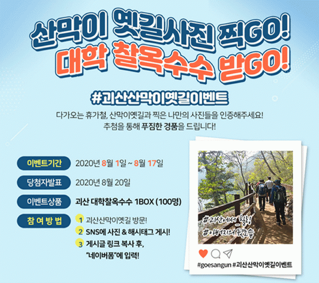 À̹ø SNS È«º¸ À̺¥Æ®´Â 8¿ù 1ÀϺÎÅÍ 17ÀϱîÁö ÁøÇàµÇ¸ç, ÀÌ ±â°£ Áß »ê¸·ÀÌ¿¾±æÀ» ¹æ¹®ÇØ ÀÎÁõ¼¦À» Âï°í ±«»ê±º °ø½Ä SNS ä³Î(ÆäÀ̽ººÏ,ÀνºÅ¸±×·¥)¿¡ ¾÷·ÎµåÇϸé ÀÚµ¿À¸·Î Âü°¡ÇÒ ¼ö ÀÖ´Ù.