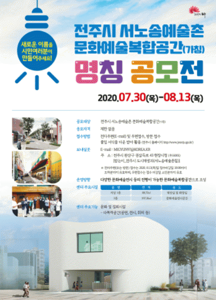 À̹ø °ø¸ðÀüÀº ÀüÁֽùÎÀÌ¸é ´©±¸³ª Âü¿©ÇÒ ¼ö ÀÖÀ¸¸ç, ¹®È¿¹¼úÀεéÀÇ Á¢±Ù¼ºÀ» ³ôÀÌ°í ½Ã¹ÎµéÀÌ Ä£±ÙÇÏ°Ô ´Ù°¡°¥ ¼ö ÀÖ´Â ¸íĪÀ» Á¤ÇÑ µÚ ÀüÁֽà ȨÆäÀÌÁö(www.jeonju.go.kr)¿¡¼ ³»·Á ¹ÞÀº °ø¸ðÁ¦¾È¼¸¦ ÀÛ¼ºÇØ ¼³ë¼Û¿¹¼úÃÌ ÇöÀå½Ãû(¿Ï»ê±¸ ±Ç»ïµæ·Î 43)À¸·Î ¹æ¹® Á¢¼öÇÏ¸é µÈ´Ù. ¶Ç ¿ìÆí ¶Ç´Â À̸ÞÀÏ(migyun97@korea.kr)·Îµµ Á¦ÃâÇÒ ¼ö ÀÖ´Ù.