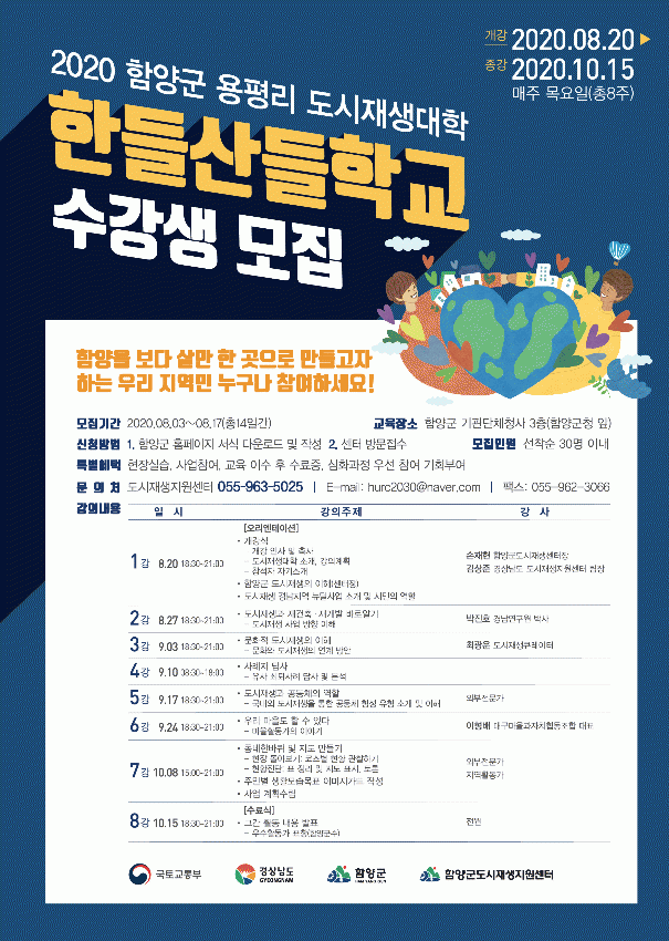 À̹ø ¿ëÆò¸® µµ½ÃÀç»ý´ëÇÐÀº 8¿ù 20ÀϺÎÅÍ 10¿ù 15ÀϱîÁö ÃÑ 8ÁÖ°£ ÁøÇàµÇ¸ç, °Àǽð£Àº ¸ÅÁÖ ¸ñ¿äÀÏ ¿ÀÈÄ 6½Ã 30ºÐºÎÅÍ 9½Ã±îÁöÀÌ´Ù.