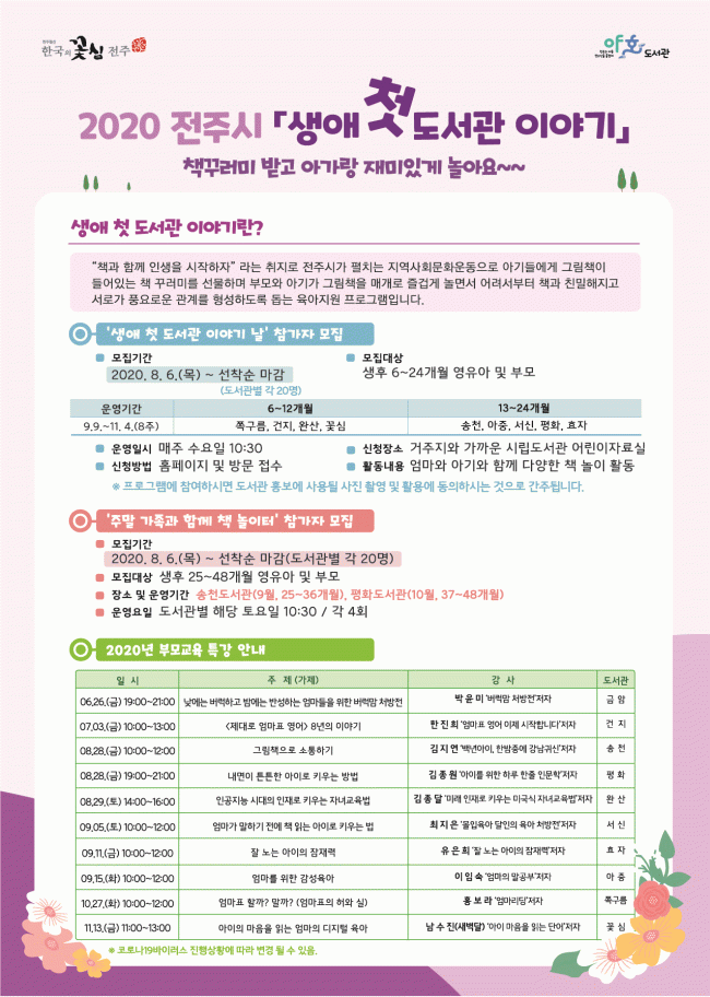 ¡®Ã¥°ú ÇÔ²² ÀλýÀ» ½ÃÀÛÇÏÀÚ¡¯¶ó´Â ÃëÁö·Î ÁøÇàµÇ´Â ¡®»ý¾Ö ù µµ¼°ü À̾߱⡯´Â »ýÈÄ 6°³¿ù¿¡¼ 48°³¿ù ¿µÀ¯¾Æ ¹× ºÎ¸ð¸¦ ´ë»óÀ¸·Î ¿À´Â 9¿ù 9ÀϺÎÅÍ 11¿ù±îÁö ¼Ûõµµ¼°üÀ» ºñ·ÔÇÑ ÀüÁÖÁö¿ª 9°³ ½Ã¸³µµ¼°ü¿¡¼ ÃÑ 8ÁÖ°£ ¿î¿µµÈ´Ù.