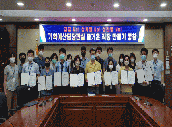 ¡°Áñ°Å¿î Á÷Àå ¸¸µé±â, ¿ì¸®´Â ÇÔ²² ÀÏÇÏ´Â µ¿·áÀÔ´Ï´Ù.¡±¶ó´Â ½½·Î°Ç ¾Æ·¡ ±èÈ£´ö ±âȹ¿¹»ê´ã´ç°üÀ» ºñ·ÔÇÑ Àü Á÷¿øÀº »ç¹«½Ç¿¡ ¸ð¿© Áñ°Å¿î Á÷Àå ¼±¾ð¹®À» ³¶µ¶Çϰí Áñ°Å¿î Á÷Àå ¸¸µé±â µ¿Âü ¼¾à¼¿¡ ´Ù °°ÀÌ ¼¸íÇß´Ù.