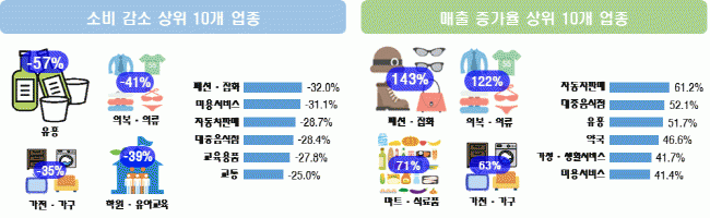Äڷγª19 ÀÎÇÑ °æ±âħü ÇöȲÀ» ºÐ¼®ÇÑ °á°ú, ¼Òºñ°¨¼Ò°¡ °¡Àå Å« ¾÷Á¾Àº À¯Èï(-57%), ÀǺ¹¡¤ÀÇ·ù(-41%), Çпø¡¤À¯¾Æ±³À°(-39%), °¡Àü¡¤°¡±¸(-35%), ÆÐ¼Ç¡¤ÀâÈ(-32%) ¼øÀ¸·Î ³ªÅ¸³µ´Ù.