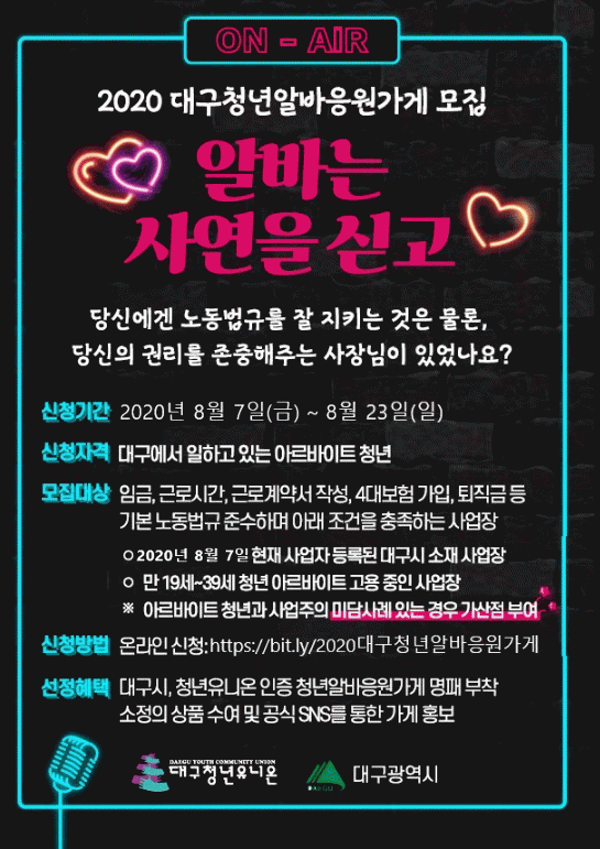½ÅûÀ» Èñ¸ÁÇÏ´Â ¾Æ¸£¹ÙÀÌÆ® û³âÀº ¸ð¹üÀÌ µÉ ÀÚ°ÝÀÌ ÀÖ´Â ¾Æ¸£¹ÙÀÌÆ® »ç¾÷ÀåÀ» ¿Â¶óÀÎ(https://bit.ly/2020´ë±¸Ã»³â¾Ë¹ÙÀÀ¿ø°¡°Ô)À» ÅëÇØ Á¢¼öÇÒ ¼ö ÀÖÀ¸¸ç ½Åû¿¡ °üÇØ ±Ã±ÝÇÑ »çÇ×Àº ´ë±¸Ã»³âÀ¯´Ï¿ÂÀ¸·Î ¹®ÀÇÇÏ¸é µÈ´Ù.