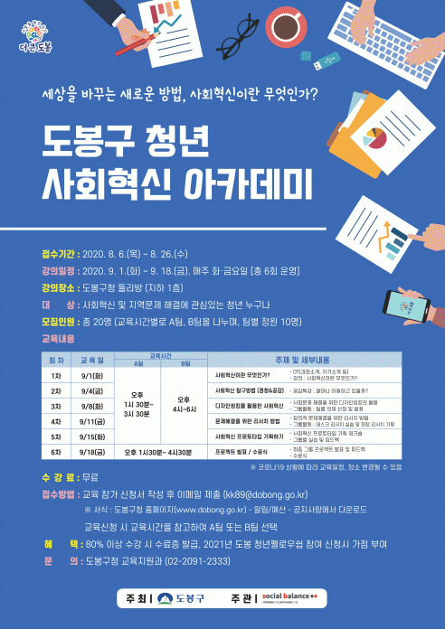 8¿ù 26ÀϱîÁö ±³À° Âü°¡ ½Åû¼¸¦ ÀÛ¼ºÇØ À̸ÞÀÏ(kk89@dobong.go.kr)·Î Á¦ÃâÇÏ¸é µÈ´Ù. ¼½ÄÀº µµºÀ±¸Ã» ȨÆäÀÌÁö(http://www.dobong.go.kr/)ÀÇ ¾Ë¸²/¿¹»ê>°øÁö»çÇ׿¡¼ ´Ù¿î·ÎµåÇÒ ¼ö ÀÖ´Ù.