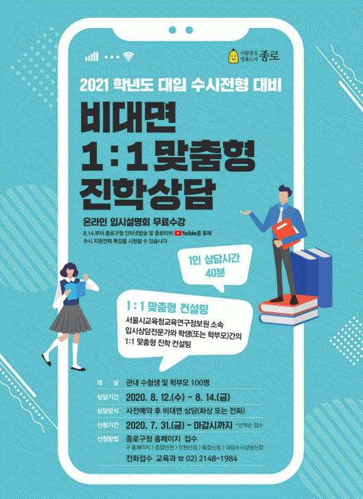 ¸ÂÃãÇü ÄÁ¼³ÆÃ Á¦°øÀ» ¿øÇÒ ½Ã ±¸Ã» ȨÆäÀÌÁö(https://www.jongno.go.kr)¿¡¼ ¿Â¶óÀÎ ½ÅûÇϰųª ±³À°°ú(¢Ï 02-2148-1984)·Î ÀüÈ ½ÅûÇÏ¸é µÈ´Ù. ´ë»óÀº °ü³» ¼öÇè»ý ¹× ÇÐºÎ¸ð ¼±Âø¼ø 100¸íÀÌ´Ù. »ó´ã Áغñ¹°·Î´Â Çб³»ýȰ±â·ÏºÎ, ÃÖ±Ù ¸ðÀǰí»ç ¼ºÀûÇ¥, ¼ö»ó½ÇÀû µîÀÌ ÀÖÀ¸¸ç »ó´ã½Ã°£Àº ÀÓÀÇ ¹èÁ¤µÉ ¼ö ÀÖ´Ù.