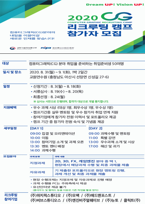 ¡®2020³â CG ¸®Äí¸£ÆÃ Ä·ÇÁ¡¯ Âü°¡ Èñ¸ÁÀÚ´Â 8¿ù 18ÀÏ(È)±îÁö Ä·ÇÁ°ø½Ä ȨÆäÀÌÁö(www.cgcamp2020.kr)¸¦ ÅëÇØ Âü°¡½Åû¼¿Í Æ÷Æ®Æú¸®¿À¸¦ Á¦ÃâÇÏ¸é µÈ´Ù.