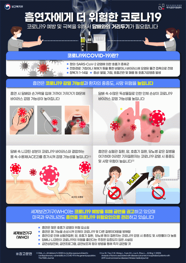 ±×¸®ÇÏ¿© ¼¼°èº¸°Ç±â±¸(WHO)´Â Äڷγª19¿¹¹æÀ» À§ÇØ ±Ý¿¬À» ±Ç°íÇÏ¿© ±Ý¿¬»ó´ãÀüÈ, ±Ý¿¬ÇÁ·Î±×·¥, ±Ý¿¬º¸Á¶Á¦ µîÀÇ ¹æ¹ýÀ» ÅëÇØ Áï°¢ ±Ý¿¬ÇÒ °ÍÀ» ±Ç°íÇϰí ÀÖ´Ù.