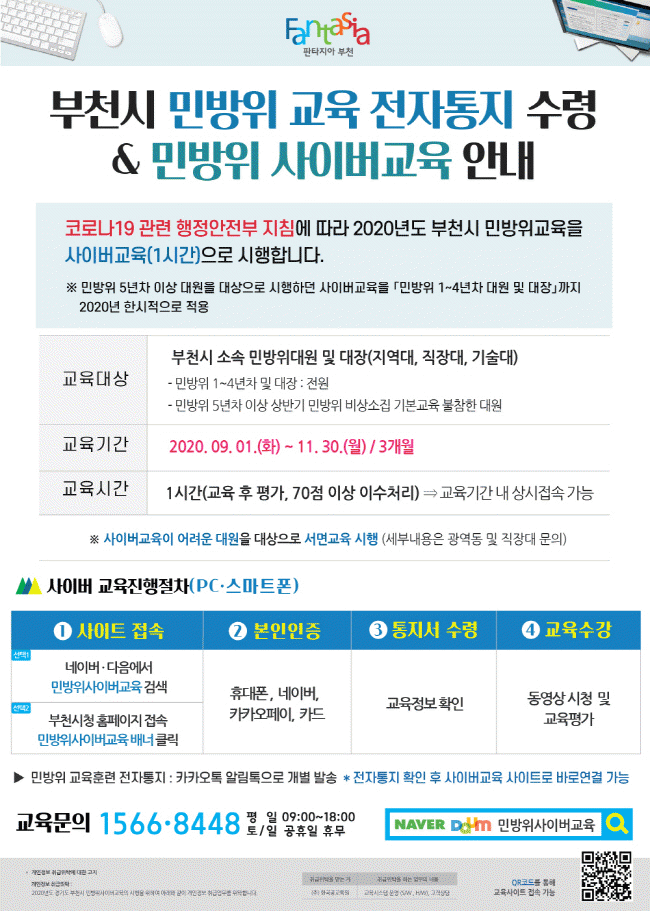 »çÀ̹ö±³À°Àº ºÎõ½Ã ¼Ò¼Ó Àü ¹Î¹æÀ§ ´ë¿ø ´ë»óÀ¸·Î 9¿ù 1ÀϺÎÅÍ 11¿ù 30ÀϱîÁö 3°³¿ù°£ ¿î¿µÇÑ´Ù. ¼ö°À» ¿øÇÒ °æ¿ì PC³ª ½º¸¶Æ®ÆùÀ¸·Î ºÎõ½Ãû ȨÆäÀÌÁö ÇÏ´ÜÀÇ ¹Î¹æÀ§»çÀ̹ö±³À° ¹è³Ê¸¦ Ŭ¸¯Çϰųª ¹Î¹æÀ§»çÀ̹ö±³À°¿¡ Á¢¼ÓÇØ 1½Ã°£ °úÁ¤ÀÇ »çÀ̹ö±³À°À» À̼öÇÏ¸é µÈ´Ù.