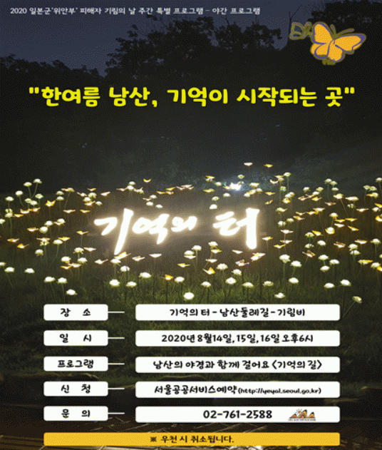 ¼¿ï½Ã´Â ³²»ê ±â¾ïÀÇ ÅÍ(¼¿ï½Ã Áß±¸ ¿¹À嵿 2-1¹øÁö)¿¡¼ ±â¸²ºñ(³²»êµµ¼°ü ¿· ȸÇöµ¿1°¡ 100-266)±îÁö À̾îÁö´Â ¡®±â¾ïÀÇ ±æ¡¯À» Á¶¼º, ¹®ÈÇØ¼³ »ç¾÷À» ÅëÇØ ÀϺ»±º ¡®À§¾ÈºÎ¡¯ ÇÇÇØÀÚÀÇ ¸í¿¹È¸º¹ ¹× ¿ª»çÇöÀå±³À°ÀÇ ÀåÀ¸·Î Ȱ¿ëÇϰí ÀÖÀ¸¸ç, À̹ø ±â¸²ÀÇ ³¯(8¿ù14ÀÏ)À» ¸ÂÀÌÇØ4Àϰ£ ±â¸²ºñ¿Í ±â¾ïÀÇ ÅÍ »ó¼³Çؼ³ ¹× ¡®±â¾ïÀÇ ±æ¡¯ ¾ß°£ Ưº° ÇÁ·Î±×·¥À» »õ·Ó°Ô °³ÃÖÇÑ´Ù.