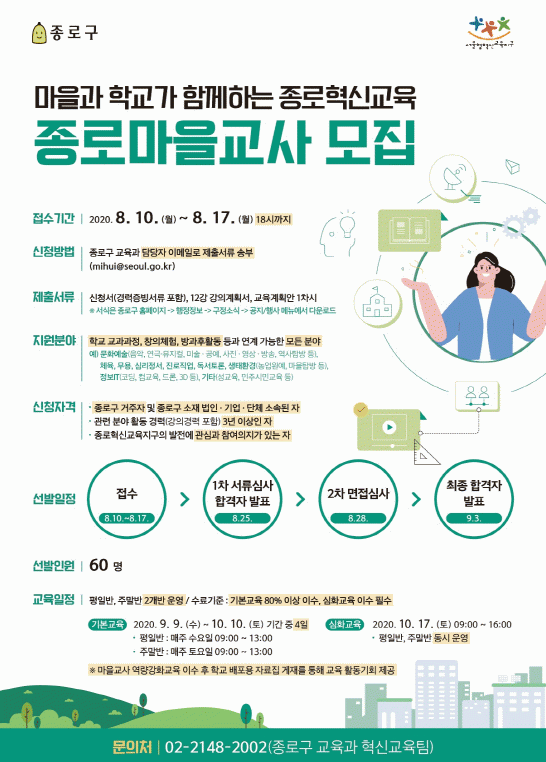 ½ÅûÀº 17ÀÏ(¿ù) ¿ÀÈÄ 6½Ã±îÁö ±¸Ã» ȨÆäÀÌÁö(https://www.jongno.go.kr)¿¡¼ ¼·ù ¾ç½ÄÀ» ´Ù¿î·ÎµåÇØ ÀÛ¼ºÇÑ ÈÄ ±³À°°ú ´ã´çÀÚ À̸ÞÀÏ(mihui@seoul.go.kr)·Î Á¦ÃâÇÏ¸é µÈ´Ù. Á¦Ãâ ¼·ù·Î´Â ½Åû¼, °Àǰèȹ¼, ±³À°°èȹ¾È µîÀÌ ÀÖÀ¸¸ç ±¸´Â 1Â÷ ¼·ù½É»ç¿Í 2Â÷ ¸éÁ¢½É»ç¸¦ °ÅÃÄ 9¿ù 3ÀÏ(¸ñ) ÇÕ°ÝÀÚ¸¦ ¹ßÇ¥ÇÒ ¿¹Á¤ÀÌ´Ù.