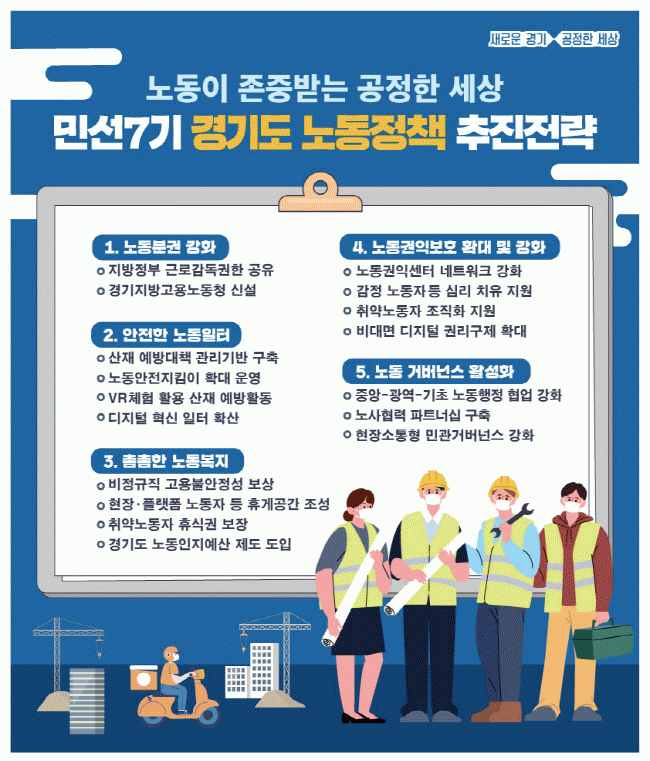 ÀÌ¿¡ °æ±âµµ´Â ¡®³ëµ¿ÀÌ Á¸Áß¹Þ´Â °øÁ¤ÇÑ ¼¼»ó¡¯À» ¹Î¼±7±â ³ëµ¿Á¤Ã¥ ºñÀüÀ¸·Î È®¸³ÇÏ°í ¨ç³ëµ¿ºÐ±Ç °È ¨è¾ÈÀüÇÑ ³ëµ¿ÀÏÅÍ Á¶¼º ¨éÃÎÃÎÇÑ ³ëµ¿º¹Áö ½ÇÇö ¨ê³ëµ¿±ÇÀͺ¸È£ È®´ë ¹× °È ¨ë³ëµ¿ °Å¹ö³Í½º Ȱ¼ºÈ µî 5°³ ºÐ¾ß ÃßÁøÀü·«À» ¼³Á¤ÇØ ´Ù¾çÇÑ Á¤Ã¥°ú »ç¾÷µéÀ» ÃßÁøÇÑ´Ù.