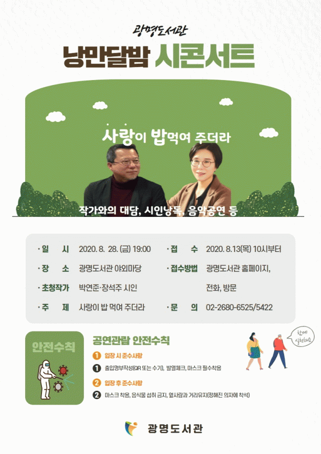 ±¤¸íµµ¼°ü Ư¼ºÈ »ç¾÷ÀÎ ¡®½Ã°¡ ÀÖ´Â µµ¼°ü¡¯ ÇÁ·Î±×·¥ÀÇ ÀÏȯÀ¸·Î ¸¶·ÃµÈ À̹ø ½Ã(ãÌ)ÄܼƮ´Â ¡®»ç¶ûÀÌ ¹ä ¸Ô¿© ÁÖ´õ¶ó¡¯¸¦ ÁÖÁ¦·Î ¹Ú¿¬ÁØ, Àå¼®ÁÖ ½ÃÀΰúÀÇ ´ë´ã, ½ÃÀγ¶¼ÛÀ» ºñ·ÔÇØ À½¾Ç°ø¿¬µµ ÇÔ²² ¿¹Á¤µÇ¾î ÀÖ¾î Äڷγª 19·Î ÁöÄ£ ½Ã¹Îµé¿¡°Ô ¿©¸§¹ã Å« À§·Î°¡ µÇ¾îÁÙ °ÍÀ¸·Î ±â´ëµÈ´Ù.