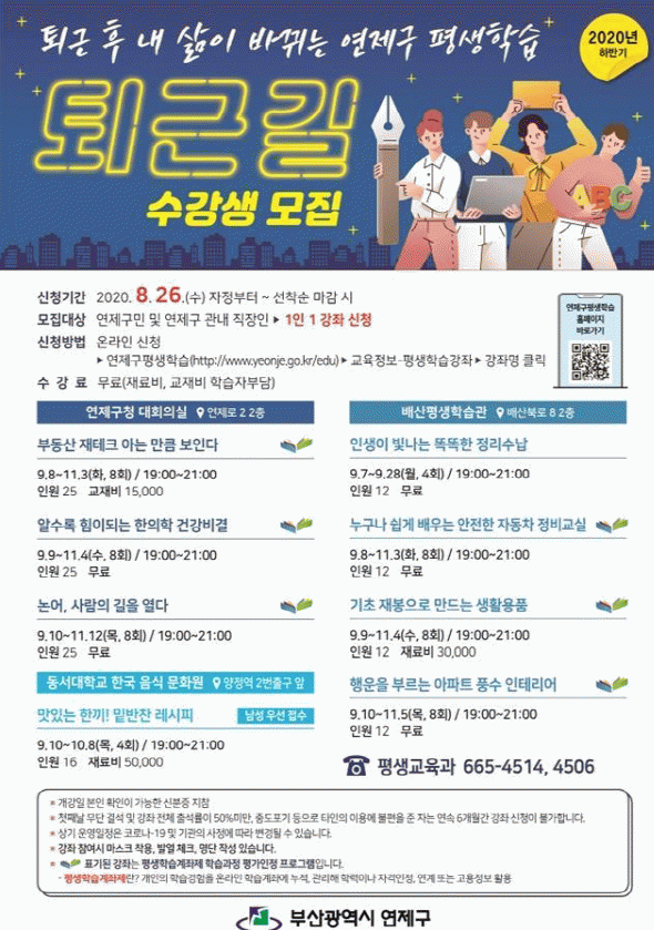 Åð±Ù±æ ÇÁ·Î±×·¥Àº 9¿ùºÎÅÍ 11¿ù±îÁö 8°³ °Á·Π¿î¿µµÇ¸ç, Á¢¼ö´Â ¿À´Â 26ÀϺÎÅÍ ¿¬Á¦±¸Æò»ýÇнÀȨÆäÀÌÁö(www.yeonje.go.kr/edu)¿¡¼ ÇÏ¸é µÈ´Ù.