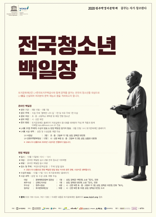 ´ë»ó 1¸í¿¡°Ô´Â ¹®ÈüÀ°°ü±¤ºÎÀå°ü»ó°ú ÀåÇÐ±Ý 100¸¸ ¿ø, ÃÖ¿ì¼ö»ó 1¸í¿¡°Ô´Â °¿øµµÁö»ç»ó°ú ÀåÇÐ±Ý 50¸¸ ¿ø, ¿ì¼ö»ó 6¸í¿¡°Ô´Â ¿øÁÖ½ÃÀå»ó°ú ÀåÇÐ±Ý 10¸¸ ¿ø, Àå·Á»ó 16¸í¿¡°Ô´Â ÅäÁö¹®ÈÀç´Ü»ó°ú ÀåÇÐ±Ý 5¸¸ ¿øÀÌ ÁÖ¾îÁø´Ù.