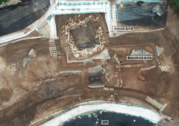 ÅëÀϽŶó ½Ã´ë Áý¼öÁ¤Àº Á¶¼± ½Ã´ë Áý¼öÁ¤ÀÇ ÇÏÃþ°ú °¡¸²¼º ºÏ¼ºº® »çÀÌ¿¡¼ È®ÀεǾú´Ù. ±æÀÌ 15m, ±íÀÌ 2.8m ÀÌ»óÀÇ Å©±â·Î Æò¸éÀº ¿øÇüÀ» ¶ç°í ÀÖÀ¸¸ç, ¹°À» °¡¿îµ¥·Î ¸ðÀ¸´Â Áý¼öÁ¤°ú ±× ¿Ü°û¿¡ µ¹·Î ÃàÁ¶ÇÑ ¹°À» Â÷´ÜÇÏ´Â ½Ã¼³°ú ¹è¼ö¸¦ °âÇÑ ¼ö·Î°¡ µ¹¾Æ°¡´Â ÇüÅ·Î, ºÎ¿© ¼®¼º»ê¼º¿¡¼ È®ÀÎµÈ Áý¼öÁ¤°úµµ À¯»çÇÏ´Ù. ³»ºÎ¿Í ÁÖº¯ ÅäÃþ Á¶»ç¸¦ ÅëÇØ Áý¼öÁ¤ÀÇ ÃÖÃÊ Ã༺ ½Ã±â¿Í ÃàÁ¶ ¹æ½ÄÀ» ¸íÈ®È÷ ¹àÈú ¿¹Á¤ÀÌ´Ù.
