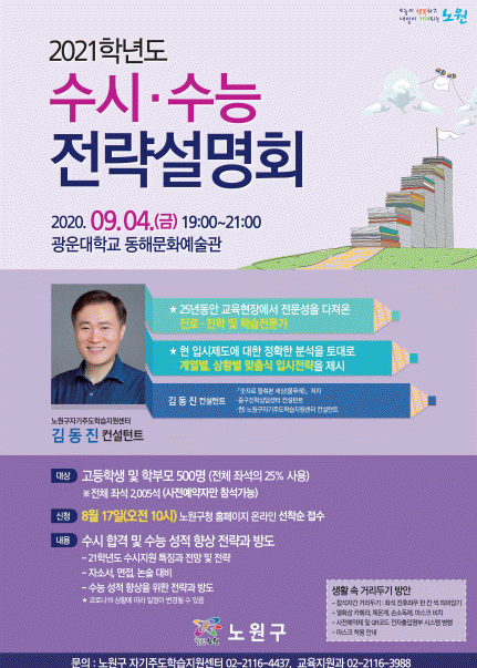 ÁøÇàÀº ³ë¿ø±¸ ÀÚ±âÁÖµµÇнÀÁö¿ø¼¾ÅÍ Ãʺù ÄÁ¼³ÅÏÆ® ±èµ¿Áø ¼ÒÀåÀÌ ¸ÃÀ¸¸ç, ÁÖ¿ä³»¿ëÀº ¡ã2021Çг⵵ ¼ö½ÃÁö¿øÀÇ Æ¯Â¡ ¹× Áö¿øÀü·« ¡ãÀÚ±â¼Ò°³¼, ¸éÁ¢, ³í¼ú ´ëºñ¹æ¾È ¡ã¼ö´É¼ºÀû Çâ»óÀ» À§ÇÑ Àü·«°ú ¹æµµ µîÀ» ´Ù·é´Ù.