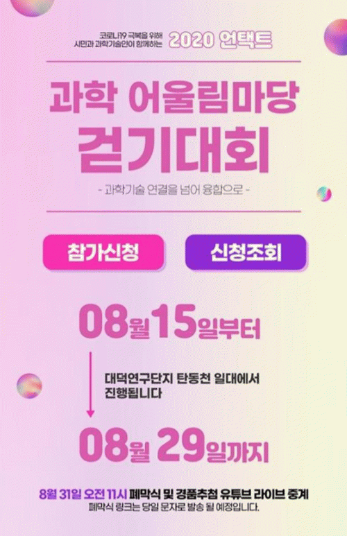 Âü°¡ ½ÅûÀº ¡®2020 °úÇÐ ¾î¿ï¸²¸¶´ç °È±â´ëȸ¡¯ ȨÆäÀÌÁö(https://fest.hellodd.com/walking/)¿¡¼ ÇÒ ¼ö ÀÖÀ¸¸ç, ¿¬±¸´ÜÁö ¿îµ¿Àå ±¹±â°Ô¾ç´ë¿¡¼ Ãâ¹ßÇÏ¸é µÈ´Ù.