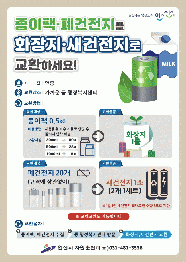 ½Ã¹Î ´©±¸³ª Á¾ÀÌÆÑ°ú Æó°ÇÀüÁö¸¦ °¡±î¿î µ¿ ÇàÁ¤º¹Áö¼¾ÅÍ¿¡ ¹æ¹®ÇØ ¹èÃâÇϸé Á¾ÀÌÆÑ 0.5kg´ç ÈÀåÁö 1·Ñ, Æó°ÇÀüÁö 20°³´ç »õ °ÇÀüÁö 1Á¶(2°³ 1¼¼Æ®)¸¦ ¹ÞÀ» ¼ö ÀÖ´Ù.