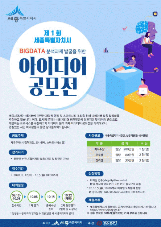 À̹ø °ø¸ðÀüÀº µµ½ÃÀÇ ¹®Á¦ ¹ß±¼°ú ÇØ°á °úÁ¤¿¡ ½Ã¹ÎÀÌ Âü¿©ÇÏ´Â ÇÁ·Î¼¼½º¸¦ ±¸ÃàÇϱâ À§ÇÑ °ÍÀ¸·Î, ¿À´Â 10¿ù 5ÀÏ 18½Ã±îÁö À̸ÞÀÏ(abigcity@korea.kr)À» ÅëÇØ Á¢¼ö ¹Þ´Â´Ù.