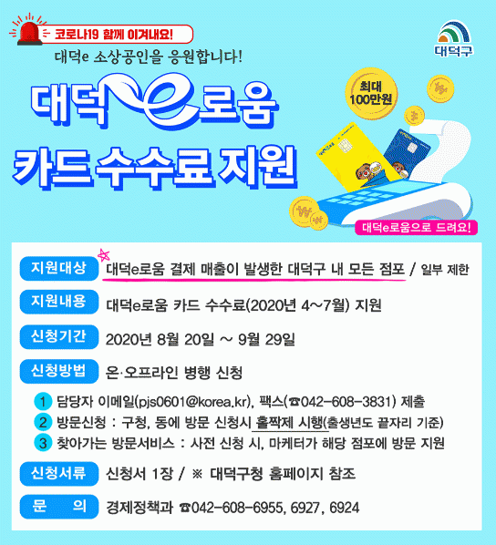 ½ÅûÀº ¿À´Â 20ÀϺÎÅÍ 9¿ù 29ÀϱîÁö, ´ë´ö±¸ ³» µ¿ÇàÁ¤º¹Áö¼¾ÅÍ¿Í ±¸Ã», À̸ÞÀÏ, ÆÑ½º µîÀ¸·Î °¡´ÉÇϸç ã¾Æ°¡´Â ¹æ¹® ½Åûµµ ÁøÇàÇÒ ¿¹Á¤ÀÌ´Ù. ÆíÀǸ¦ À§ÇØ ½Åû¼·ù´Â ½Åû¼ 1ÀåÀ¸·Î °£¼ÒÈÇßÀ¸¸ç, ¼ö¼ö·á Áö±ÞÀº ¼Ò»ó°øÀÎ ¸íÀÇÀÇ ´ë´öe·Î¿ò Ä«µå·Î ÃæÀüÇØÁØ´Ù. ´ë´öe·Î¿ò Ä«µå°¡ ¾ø´Â ¼Ò»ó°øÀÎÀÇ °æ¿ì, ¼ö¼ö·á¸¦ ½ÅûÇÏ¸é¼ Ä«µå¸¦ Áï½Ã ¹ß±Þ¹ÞÀ» ¼ö ÀÖ´Ù.
