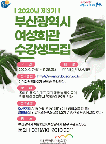 ±âÃÊ»ýȰ¼ö±ÞÀÚ µî »çȸÀû ¹è·Á°èÃþÀ» À§ÇÑ [¿ì¼±¸ðÁý]Àº 8¿ù 18ÀϺÎÅÍ 20ÀϱîÁöÀ̸ç, [ÀϹݸðÁý]Àº 8¿ù 24ÀϺÎÅÍ 9¿ù 6ÀϱîÁöÀÌ´Ù. °³° ÀÌÈÄ [Ãß°¡¸ðÁý]Àº 9¿ù 14ÀϱîÁö ½ÃÇàµÈ´Ù. ¼ö° ½ÅûÀº ºÎ»ê±¤¿ª½Ã ¿©¼ºÈ¸°ü ȨÆäÀÌÁö(http://woman.busan.go.kr)¿¡¼ ÇÒ ¼ö ÀÖÀ¸¸ç ¼±Âø¼øÀ¸·Î ¸¶°¨µÈ´Ù. ±âŸ ÀÚ¼¼ÇÑ »çÇ×Àº ¿©¼ºÈ¸°ü ±³À°º¹ÁöÆÀ(¢Ï051-610-2010, 2011)·Î ¹®ÀÇÇÏ¸é µÈ´Ù.