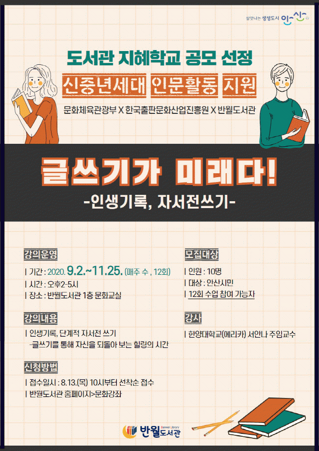 ¹Ý¿ùµµ¼°ü¿¡¼ ÁøÇàµÇ´Â ¡®µµ¼°üÁöÇýÇб³ - ±Û¾²±â°¡ ¹Ì·¡´Ù!¡¯´Â ÀÚ½ÅÀÇ ÀλýÀ» µÇµ¹¾Æº¸´Â ÀÚ¼Àü ¾²±â¿Í ÇູÇÑ Àλý 2¸· ¼³°è¸¦ ÁÖÁ¦·Î ÇÑ ÇÁ·Î±×·¥À¸·Î ´ÙÀ½´Þ 2ÀϺÎÅÍ ¿À´Â 11¿ù25ÀϱîÁö ¸ÅÁÖ ¼ö¿äÀϸ¶´Ù 12ÁÖ µ¿¾È ¼¾È³ª ÇѾç´ëÇб³ ±³¼ö¿Í ÇÔ²² ÇÒ ¿¹Á¤ÀÌ´Ù.