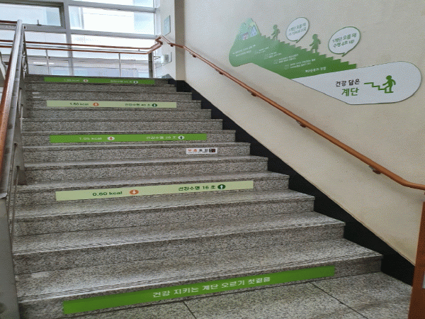 1ÃþºÎÅÍ 3Ãþ±îÁö °è´Ü°È±â¸¦ ÇÒ ¶§ ¼Ò¸ðµÇ´Â Ä®·Î¸® ¾ç µîÀ» ÀûÀº ½ºÆ¼Ä¿¿Í ¿¤¸®º£ÀÌÅÍ ÀÌ¿ë ´ë½Å °è´Ü°È±â¸¦ À¯µµÇÏ´Â ¾È³» ¹®±¸¸¦ °è´Ü°ú º®¸é¿¡ ºÎÂøÇß´Ù.