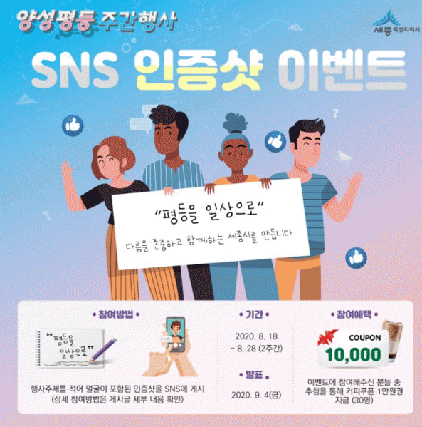 À̹ø SNS ÀÎÁõ¼¦ À̺¥Æ® Âü¿©´Â ¿ÃÇØ ÁÖÁ¦ÀÎ ¡®ÆòµîÀ» ÀÏ»óÀ¸·Î ´Ù¸§À» Á¸ÁßÇϰí ÇÔ²² ÇÏ´Â ¼¼Á¾À» ¸¸µì´Ï´Ù¡¯¸¦ A4 ¿ëÁö¿¡ Àû¾î º»ÀÎ ¾ó±¼ÀÌ Æ÷ÇÔµÈ ÀÎÁõ ¼¦À» ÃÔ¿µ ÈÄ °³ÀÎ SNS¿¡ °Ô½ÃÇÏ¸é µÈ´Ù.