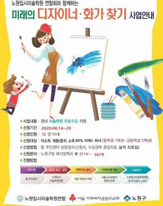 ³ë¿ø±¸´Â 2016³â 6¿ù ³ë¿ø±¸ ÀԽù̼úÇпø¿¬ÇÕȸ¿Í Çù¾àÀ» ¸Î°í ¾î·Á¿î °¡Á¤ÀÇ Ã»¼Ò³âµé¿¡°Ô ¹Ì¼ú±³À°ÀÇ ±âȸ¸¦ ¹«·á·Î Á¦°øÇϰí ÀÖ´Ù. ¡¸¹Ì·¡ÀÇ µðÀÚÀ̳ʡ¤È°¡ ã±â¡¹»ç¾÷À» ÅëÇØ Àú¼ÒµæÃþ û¼Ò³â¿¡°Ô ¿¹´É Ȱµ¿°ú ÀԽñ³À° ±âȸ¸¦ Á¦°øÇϰí ÀÖÀ¸¸ç Àç´ÉÀ» °è¹ßÇÏ°í ´É·ÂÀ» ÆîÄ¥ ¼ö ÀÖ´Â µðµõµ¹ ¿ªÇÒÀ» Çϰí ÀÖ´Ù.