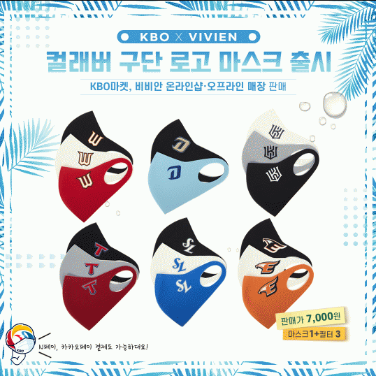 ¸¶½ºÅ© Àü¸éºÎ¿¡´Â KBO ¸®±× 6°³ ±¸´Ü(SK, NC, KT, KIA, »ï¼º, ÇÑÈ)ÀÇ ·Î°í°¡ Àû¿ëµÆ°í, °¢ ±¸´Ü º°·Î 2~3°¡Áö »ö»óÀÇ Á¦Ç°À¸·Î Ãâ½ÃµÈ´Ù. ¸¶½ºÅ© ¾ÈÂÊ¿¡´Â Å»ºÎÂø °¡´ÉÇÑ MELT SPUN(KF-94) ÇÊÅͰ¡ ÀÖÀ¸¸ç, ÇÊÅÍ´Â ÀÏȸ¿ëÀ¸·Î »ç¿ëÇÏ°í ¸¶½ºÅ©´Â ¹°¿¡ ¼¼Ã´ÇØ ¿©·¯ ¹ø »ç¿ëÇÒ ¼ö ÀÖ´Ù.