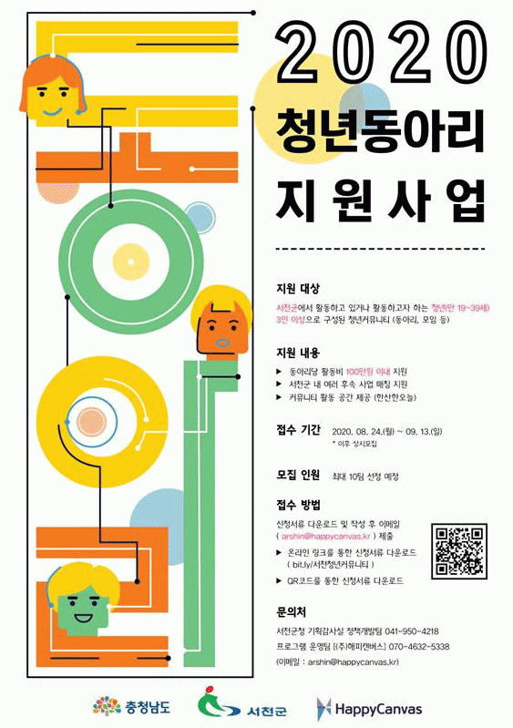 ½ÅûÀº ¿Â¶óÀÎ ¸µÅ©(bit.ly/¼ÃµÃ»³âÄ¿¹Â´ÏƼ)³ª QRÄڵ带 ÅëÇØ Ȱµ¿°èȹ¼ µîÀÇ ½Åû¼¸¦ ³»·Á¹Þ¾Æ »ç¾÷ ´ã´çÀÚ À̸ÞÀÏ(arshin@happycanvas.kr)·Î Á¦ÃâÇÏ¸é µÈ´Ù.