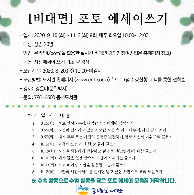 ¿Â¶óÀÎ(Zoom)À» Ȱ¿ëÇÑ ½Ç½Ã°£ ºñ´ë¸é °ÀÇ·Î ¿î¿µµÇ´Â ¡®Æ÷Åä ¿¡¼¼À̾²±â¡¯´Â °Àº¹Ì(¹®Çйڻç)°»çÀÇ Áöµµ·Î ¡â´Ù¾çÇÑ Çü½ÄÀÇ »çÁø ¿¡¼¼ÀÌ °¨»ó ¡âÀÏ»ó »çÁøÀ» Ű¿öµå·Î ±Û¾²±â ¡âÆ÷Åä ¸ÞÀÌÅ· ±â¹ýÀ» Ȱ¿ëÇÑ ±×¸²ÀÚ ±Û¾²±â µîÀ» ³»¿ëÀ¸·Î ÁøÇàÇϸç, ÈÄ¼Ó È°µ¿À¸·Î ¼ö¾÷ Ȱµ¿ ÀÛǰÀ» ´ãÀº Æ÷Åä¿¡¼¼ÀÌ ¸ðÀ½ÁýÀ» Á¦ÀÛÇÏ°Ô µÈ´Ù.