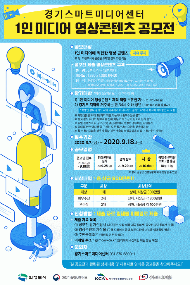 À̹ø °ø¸ðÀüÀº °æ±âµµ Áö¿ª û³âµéÀÇ µ¶Ã¢ÀûÀÎ ¿µ»ó ÄÜÅÙÃ÷ Á¦ÀÛÀ» Àå·ÁÇϰí 1ÀÎ ¹Ìµð¾î ºÐ¾ß â¾÷ ¿ª·® °È¸¦ Áö¿øÇÏ¿© °æ±âµµ Áö¿ªÀÇ 1ÀÎ ¹Ìµð¾î »ê¾÷À» Ȱ¼ºÈÇϱâ À§ÇØ ¸¶·ÃµÇ¾úÀ¸¸ç, °ø¸ð ´ë»óÀº 1ÀÎ ¹Ìµð¾î Ç÷§Æû¿¡ ÀûÇÕÇÑ ¿µ»ó ÄÜÅÙÃ÷·Î¼ ¼ø¼ö âÀÛ¹°À̾î¾ß Çϸç ÁÖÁ¦ Á¦ÇÑÀº ¾ø´Ù.