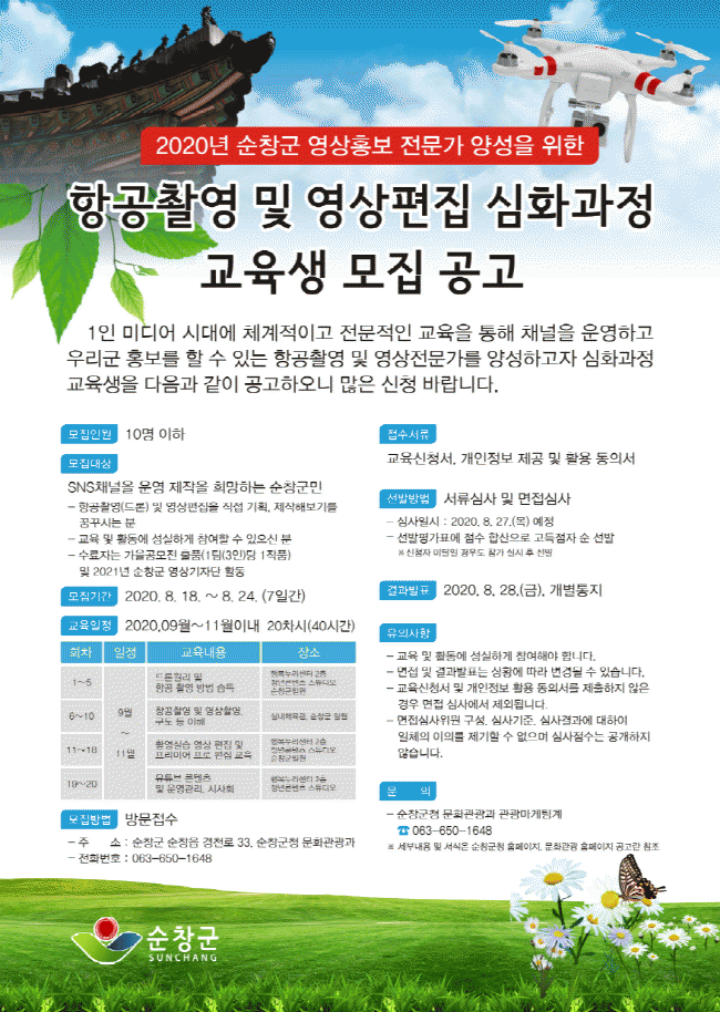 ±³À°Àº ¿À´Â 9¿ùºÎÅÍ 11¿ù±îÁö ÃÑ 20ȸ¿¡ °ÉÃÄ ÁøÇàµÇ¸ç, µå·Ð¿ø¸®ºÎÅÍ Ç×°ø ÃÔ¿µ¹æ¹ý, ÃÔ¿µ±¸µµ, ¿µ»óÆíÁý µî ¿µ»óÀü¹®°¡ ¾ç¼ºÀ» À§ÇÑ ±âÃʰúÁ¤ÀÌ ¾Æ´Ñ ½ÉÈ °úÁ¤À¸·Î ÁغñÇß´Ù.