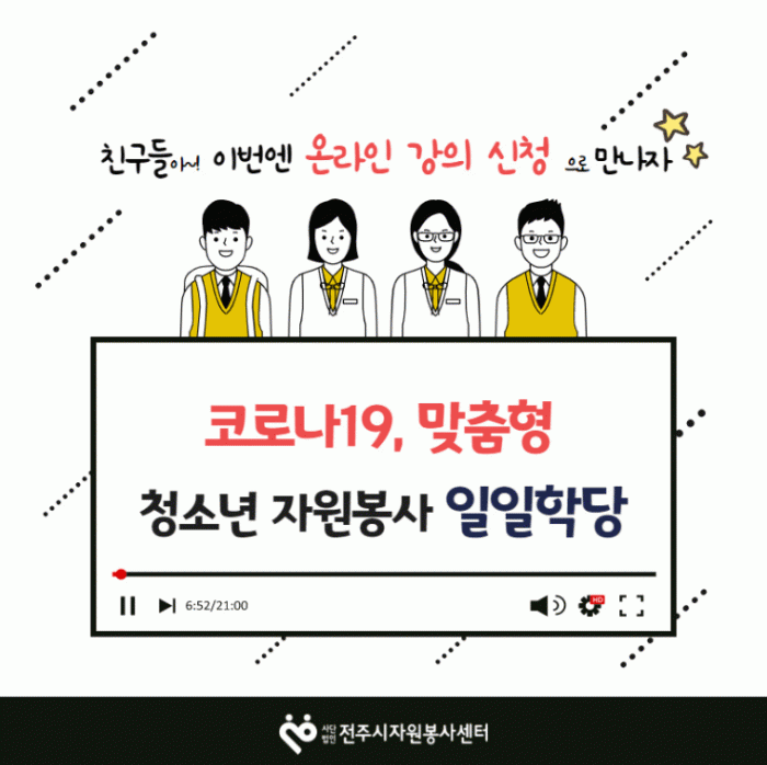 Âü¿©¹æ¹ýÀº ÀüÁÖ½ÃÀÚ¿øºÀ»ç¼¾ÅÍ È¨ÆäÀÌÁö(www.jeonjuvc.or.kr)¿Í ÆäÀ̽ººÏÀ» ÅëÇØ Á¢¼Ó °¡´ÉÇÏ¸ç ¿Â¶óÀÎ ±³À°À¸·Î ¡âÀÚ¿øºÀ»ç ±âÃʱ³À° ¡â½º¸¶Æ®Æù Áßµ¶ ¿¹¹æ±³À° ¡â°ÔÀÓ°ú µµ¹Ú ±¸º°Çϱ⠡â¾Ë±â ½¬¿î ±ÝÀ¶À̾߱⠡â½ÉÆó¼Ò»ý¼ú ¡âÀúÃâ»ê °í·É»çȸ ¡âû¼Ò³â ±Ý¿¬ ¿Ã¹Ù¸¥ ÀÌÇØ µî ÃÑ 6°³ µ¿¿µ»óÀ» ½ÃûÇÏ°í ±¸±Û Áú¹®Áö¸¦ Á¦ÃâÇϸé 1ÇÁ·Î±×·¥ ´ç 1½Ã°£ÀÇ ºÀ»ç½ÇÀûÀ» ÀÎÁ¤¹ÞÀ» ¼ö ÀÖ´Ù.