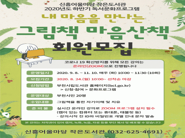 ¡®³» ¸¶À½À» ¸¸³ª´Â ±×¸²Ã¥ »êÃ¥¡¯Àº ±×¸²Ã¥À» °¨»óÀ» ÅëÇÑ ÀÌÇØ¿Í Ä¡À¯¸¦ ¸ñÀûÀ¸·Î Äڷγª19·Î ÁöÄ£ ½Ã¹ÎµéÀÌ À§·Î¹ÞÀ» ¼ö ÀÖµµ·Ï ±âȹµÈ ÇÁ·Î±×·¥ÀÌ´Ù. ¼ºÀÎ 20¸íÀ» ´ë»óÀ¸·Î Çϸç, 9¿ù 8ÀϺÎÅÍ ¸ÅÁÖ È¿äÀÏ ÃÑ 10ȸ¿¡ °ÉÃÄ ÁøÇàµÈ´Ù.