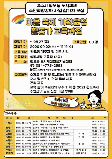 ±³À° ¼¼ºÎ³»¿ëÀº ¡®ÃàÁ¦ ¼º°ø»ç·Ê¡¤°³³ä¡¯ °ÀǸ¦ ½ÃÀÛÀ¸·Î, ¡®¿ì¸® ¸¶À» ÀÚ¿ø ã±â¡¯, ¡®ÃàÁ¦ ÄÁ¼Á ã±â¡¯, ¡®¼¼ºÎ ÇÁ·Î±×·¥ ±¸¼º¡¯, ¡®ÃàÁ¦ °ø°£ ±¸¼º ¹× ¿¬Ã⡯, ¡®ÃàÁ¦ ¿¹»ê ¹× ÀÏÁ¤ Â¥±â¡¯, ¡®¿ì¸®¸¶À» ÃàÁ¦ °èȹ¼ ¸¸µé±â¡¯, ¡®ÃàÁ¦ È«º¸¡¯, ¡®»ç¾÷°èȹ¼ ¹ßÇ¥ ¹× ½Ã»ó¡¯ µî ¸¶À» ÃàÁ¦¸¦ À§ÇÑ ½ÇÁ¦ °úÁ¤¿¡ ´ëÇØ °¢ ºÐ¾ß Àü¹®°¡µé·ÎºÎÅÍ ¹è¿ì´Â °ÀÇ¿Í ´õºÒ¾î Ÿ Áö¿ªÀÇ ¸¶À»°øµ¿Ã¼ ¹× ¼±µµÁöÀÚü µî ¿ì¼ö »ç·ÊÁö °ßÇбîÁö Æ÷ÇÔÇØ ÃÑ 10ȸÂ÷·Î ±¸¼ºµÇ¾î ÀÖ´Ù,