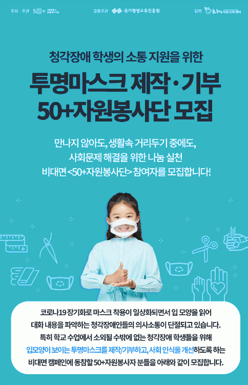 ¼¿ï½Ã50Ç÷¯½ºÀç´Ü(´ëÇ¥ÀÌ»ç ±è¿µ´ë)ÀÌ Ã»°¢Àå¾Ö ÇлýµéÀÇ ÀÏ»ó ¼ÒÅëÀ» Áö¿øÇϰí ÇлýµéÀÌ ÇнÀ±Ç¿¡¼ ¼Ò¿ÜµÇÁö ¾Êµµ·Ï ÀÔ ¸ð¾çÀÌ º¸ÀÌ´Â ¡®Åõ¸í ¸¶½ºÅ©¡¯ 1,500ÀåÀ» Á¦ÀÛ, Àϼ± ±³À°ÇöÀå¿¡ ±âºÎÇÑ´Ù°í ¹àÇû´Ù.