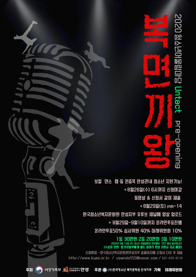 À̹ø °æ¿¬ Âü°¡´ë»óÀº 9¼¼¿¡¼ 19¼¼ ¹Ì¸¸ û¼Ò³âÀ̸ç, Âü¿©¸¦ ¿øÇϴ û¼Ò³âÀº (»ç)Çѱ¹Ã»¼Ò³âº¹Áö¹®È¿ø ¾È¼ºÁöºÎ ȨÆäÀÌÁö¿¡ °Ô½ÃµÈ Âü°¡½Åû¼¿Í ´í½º¡¤ÈüÇÕ¡¤º¸Ä᤿¬ÁÖ µî À¯Æ©ºê(¿Â¶óÀÎ Ç÷§Æû)¿¡¼ Ȱ¿ëÇÒ ¼ö ÀÖ´Â ÃÔ¿µ ¿µ»ó(5ºÐ À̳» Á¦ÇÑ)À» ¿À´Â 26ÀϱîÁö À̸ÞÀÏ(usapolo555@naver.com)·Î Á¦ÃâÇÏ¸é µÈ´Ù.