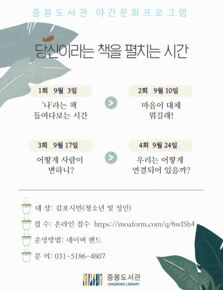 9¿ù 3ÀϺÎÅÍ 9¿ù 24ÀϱîÁö ¸ÅÁÖ ¸ñ¿äÀÏ ¿ÀÈÄ 7½Ã, 4ȸ¿¡ °ÉÃÄ ÁøÇàµÇ¸ç 8¿ù 20ÀϺÎÅÍ ÁߺÀµµ¼°ü ȨÆäÀÌÁö(https://moaform.com/q/6wISh4)¿¡¼ ¼±Âø¼ø 50¸íÀ» ¸ðÁýÇÑ´Ù.