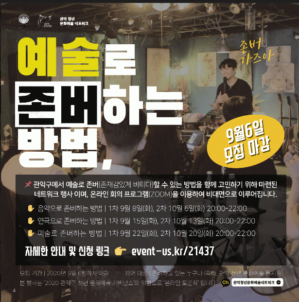¡®°ü¾Çû³â ¹®È¿¹¼ú»ó»ýÅ×ÀÌºí¡¯Àº À½¾Ç, ¿¬±Ø, ¹Ì¼ú 3°³ÀÇ ÁÖÁ¦º°·Î ÃÑ 2ȸ¾¿, ¿À´Â 9¿ù 8ÀÏ(È)ºÎÅÍ 10¿ù 20ÀÏ(È)±îÁö ¸ÅÁÖ È¿äÀϸ¶´Ù ÁøÇàµÇ¸ç ¿ÀÈÄ 8½ÃºÎÅÍ 10½Ã±îÁö ¿Â¶óÀΠȸÀÇ ÇÁ·Î±×·¥(ZOOM)À» ÀÌ¿ëÇÏ¿© ºñ´ë¸éÀ¸·Î ÀÌ·ç¾îÁø´Ù.
