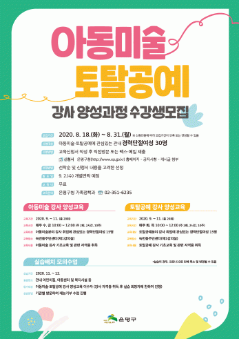 ±³À°Àº 9¿ù ~ 12¿ù ÃÑ 20ȸ(ÁÖ 2ȸ, 2½Ã°£, 10ÁÖ °úÁ¤)·Î ¾Æµ¿¹Ì¼ú ºÐ¾ß´Â ¸ÅÁÖ ¼ö¡¤±Ý 10½Ã ~ 12½Ã, ÅäÅ»°ø¿¹ ºÐ¾ß´Â ¸ÅÁÖ È¡¤¸ñ 10½Ã ~ 12½Ã¿¡ ÁøÇàµÈ´Ù. ±³À°ºñ´Â ¹«·áÀ̸ç, ±³À°Àå¼Ò´Â ³ì¹øµ¿Áֹμ¾ÅÍ·Î µ¿ÀÏÇÏ´Ù.