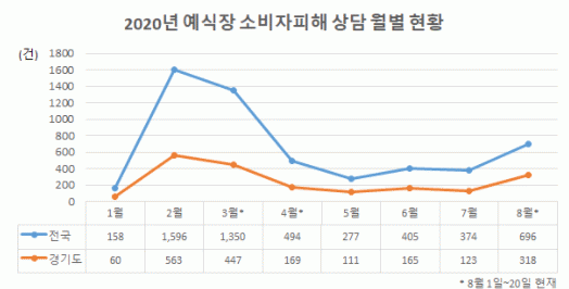 ¿ùº° »ó´ãÃßÀ̸¦ º¸¸é 1¿ù¿¡´Â 60°ÇÀÌ´ø °áÈ¥½ÄÀå °ü·Ã »ó´ãÀÌ Äڷγª°¡ È®»êµÇ´ø 2¿ù 563°Ç, 3¿ù 447°ÇÀ¸·Î Áõ°¡Çß´Ù°¡ 4¿ù ÀÌÈÄ 150°Ç ÀüÈÄ·Î °¨¼ÒÇß´Ù. ±×·¯³ª ¼öµµ±ÇÀ» Áß½ÉÀ¸·Î Äڷγª19°¡ ÀçÈ®»êµÇ¸é¼ 8¿ù¿¡¸¸ 20ÀϱîÁö 318°ÇÀÇ »ó´ãÀÌ Á¢¼öµÇ´Â µî Å«ÆøÀÇ Áõ°¡¼¼¸¦ º¸À̰í ÀÖ´Ù.
