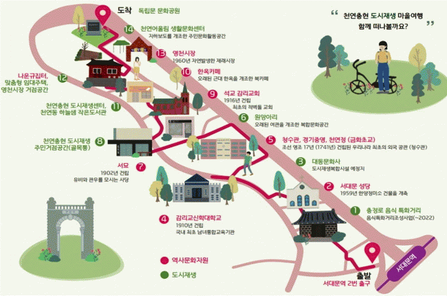 Âü¿©ÀÚµéÀº µµº¸·Î ¾à 1.2km¸¦ À̵¿ÇÏ¸ç ¼´ë¹®¼º´ç°ú û¼ö°ü ÅÍ, °æ±âÁß±º¿µ ÅÍ, ¼®±³°¨¸®±³È¸, ÇÑ¿ÁÄ«Æä, ³ª¿î±Ô ÁýÅÍ µîÀÇ ¡®¿ª»ç¹®ÈÀÚ¿ø¡¯°ú ÃæÁ¤·Î À½½ÄƯȰŸ®, õ¿¬ÃæÇö µµ½ÃÀç»ý ÁֹΰÅÁ¡°ø°£, ¸ÂÃãÇü ÀÓ´ëÁÖÅÃ, õ¿¬¾î¿ï¸² »ýȰ¹®È¼¾ÅÍ µîÀÇ ¡®µµ½ÃÀç»ý »ç¾÷Áö¡¯¸¦ ޹æÇÑ´Ù.