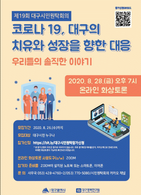 Âü°¡´Â ´ë±¸½Ã¹ÎÀÌ¸é ´©±¸³ª °¡´ÉÇϸç ÀÌ´Þ 26ÀϱîÁö ´ë±¸½Ã¹Î¿øÅ¹È¸ÀÇ È¨ÆäÀÌÁö³ª Àüȸ¦ ÅëÇØ ½ÅûÇÏ¸é µÈ´Ù. È»óÅä·ÐÀÌ Ã³À½ÀÌ¶óµµ 1:1 »ó´ãÆÀÀ» ¿î¿µÇØ ±â¼úÀû ÀûÀÀÀ» ¾È³»ÇϹǷΠºÎ´ã ¾øÀÌ ½Åû ÇÒ ¼ö ÀÖ´Ù. Âü°¡ È®Á¤ ¿©ºÎ´Â ÃßÈÄ ¹®ÀÚ·Î ¾È³»ÇÑ´Ù.